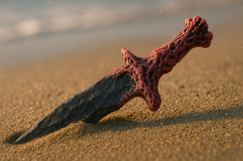 This relic is a dagger-length shard of impossibly sharp, non-terrestrial black metal that seems to absorb the light around it. A hilt of solid, crimson coral has grown around the metal shard, fused as one. The dagger is strangely cold to the touch, as if just pulled from a crushing, sunless deep.